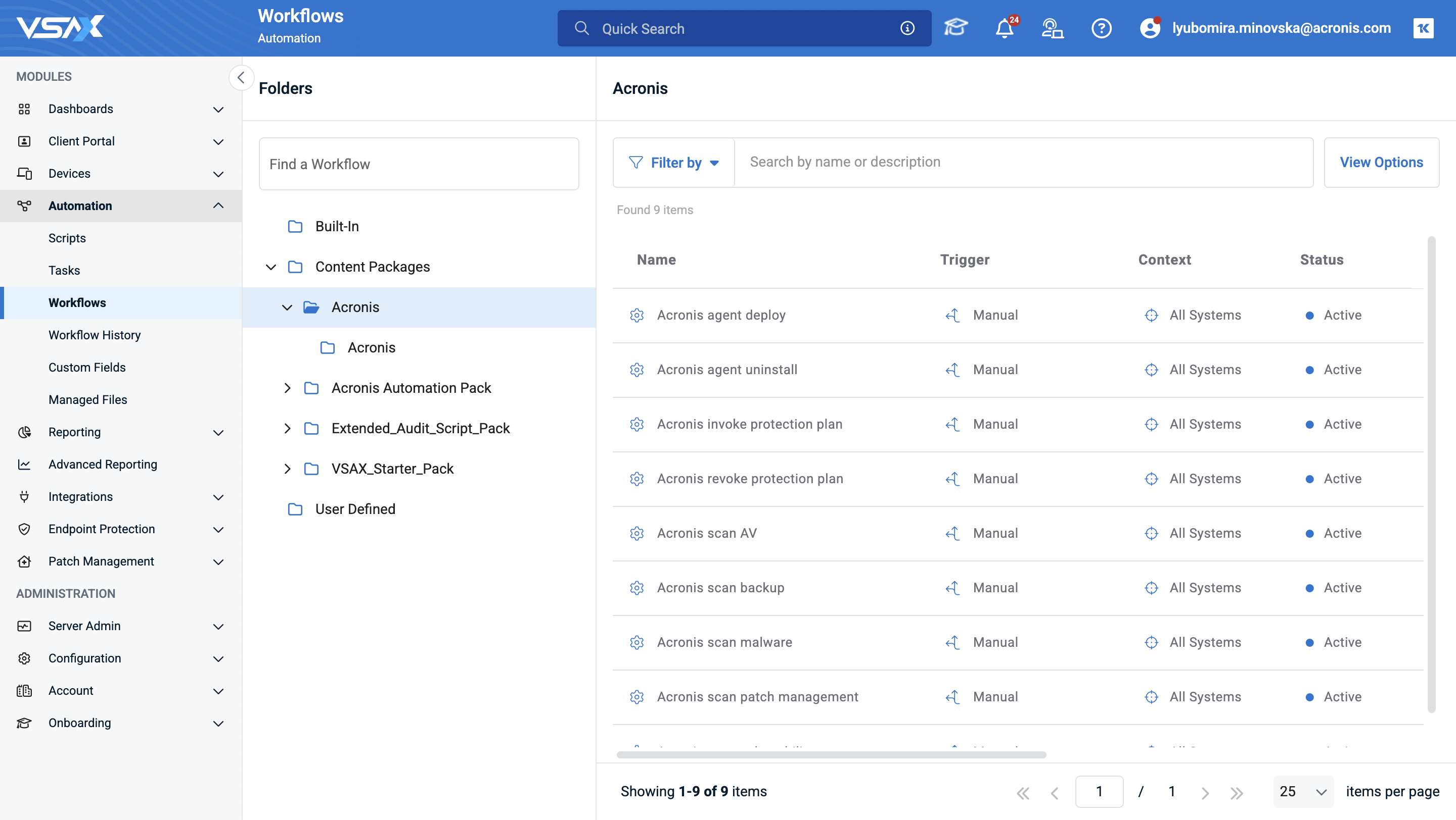 Execute Acronis tasks directly from Kaseya VSA without switching platforms. Acronis scripts are fully incorporated into Kaseya automated workflows, allowing MSPs to create automation routines that combine both platforms' capabilities. MSPs can initiate backups, run system scans, apply security updates, and perform recovery operations through familiar Kaseya procedures. The integration supports both individual and bulk task execution across multiple endpoints, with the ability to chain Acronis actions into complex workflow sequences.